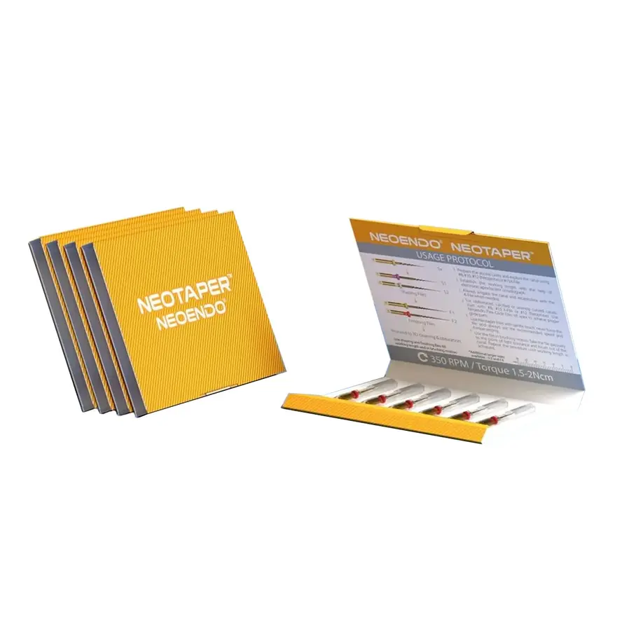 NeoEndo Neotaper NiTi Rotary Files 25mm, revolutionizing endodontic procedures with cutting-edge technology. These files boast the same metallurgy, heat treatment, and triangular cross-section as the acclaimed Neoendo Flex File, ensuring reliability and performance. Engineered with a new sequence of variable taper files, Neoendo Neotaper Files offer unparalleled cutting efficiency, reducing chair time and enhancing patient comfort. Crafted with advanced surface treatment methods, these files exhibit a distinctive golden color, indicative of superior cutting efficiency. Their exceptional cyclic fatigue resistance and safety tip design minimize the risk of apical transportation, promoting safe and effective root canal treatments. With an ideal balance of strength and flexibility, NeoEndo Neotaper Files navigate even the most challenging canals with ease. Experience the workhorse of rotary endodontics, delivering minimally invasive procedures and optimal outcomes. Trust NeoEndo for efficient, precise, and reliable root canal treatments every time.o Neotaper NiTi Rotary Files 25mm